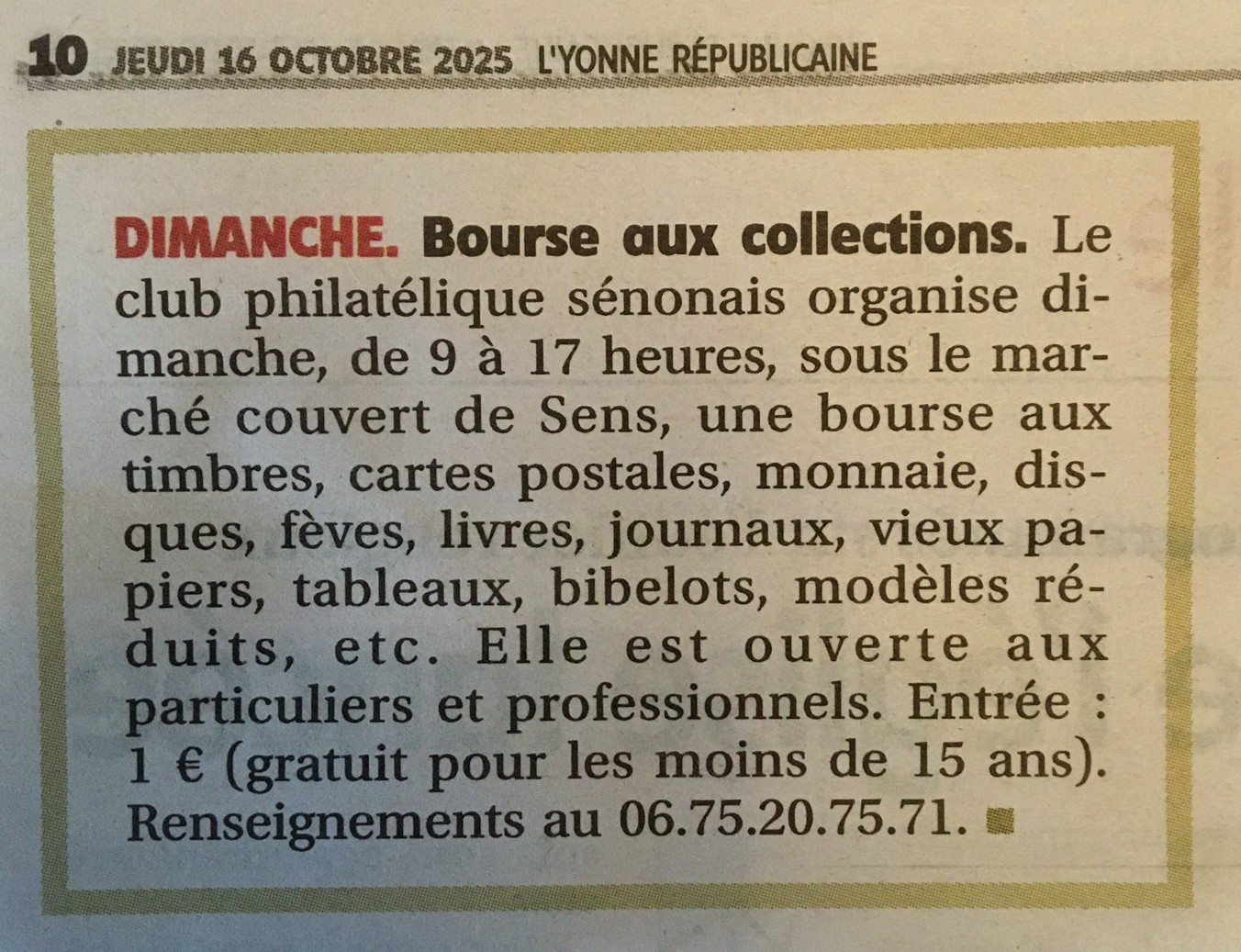 Annonce Bourse multicollections : Publié dans l'Yonne Républicaine du 16 octobre 2025 : YR du 16 octobre 2025
