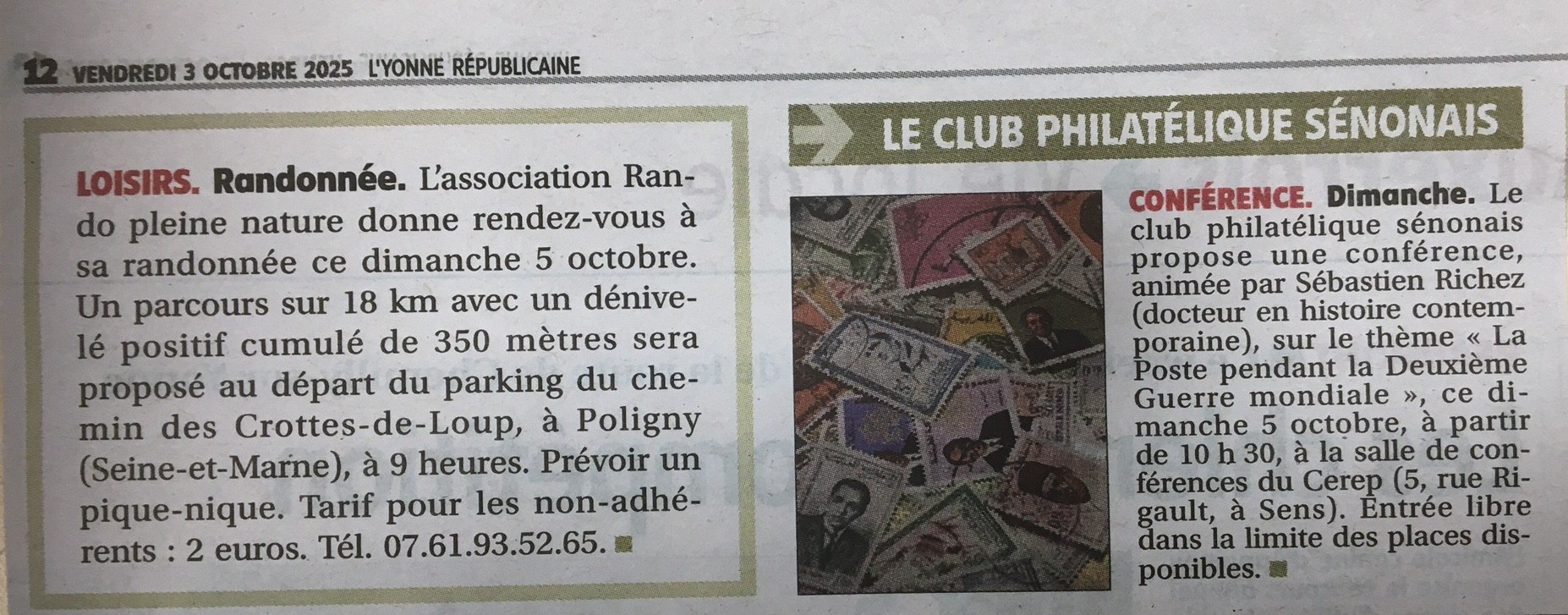 Conférence Historien de La Poste Sébastien Richez ; publié dans l'Yonne Républicaine le 3 octobre 2025 : YR du 3 octobre 2025