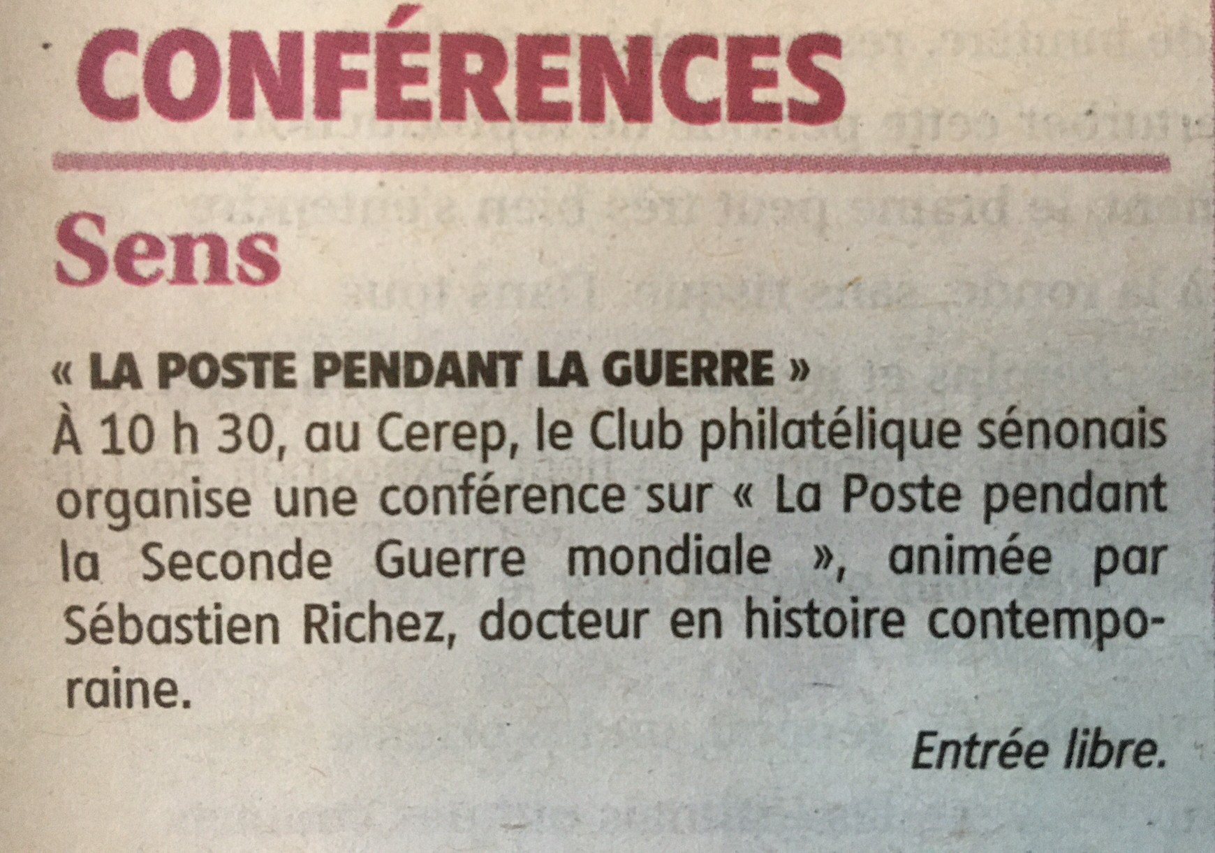 Conférence Historien de La Poste Sébastien Richez ; publié dans l'Yonne Républicaine le 4 octobre 2025 : YR du 4 octobre 2025