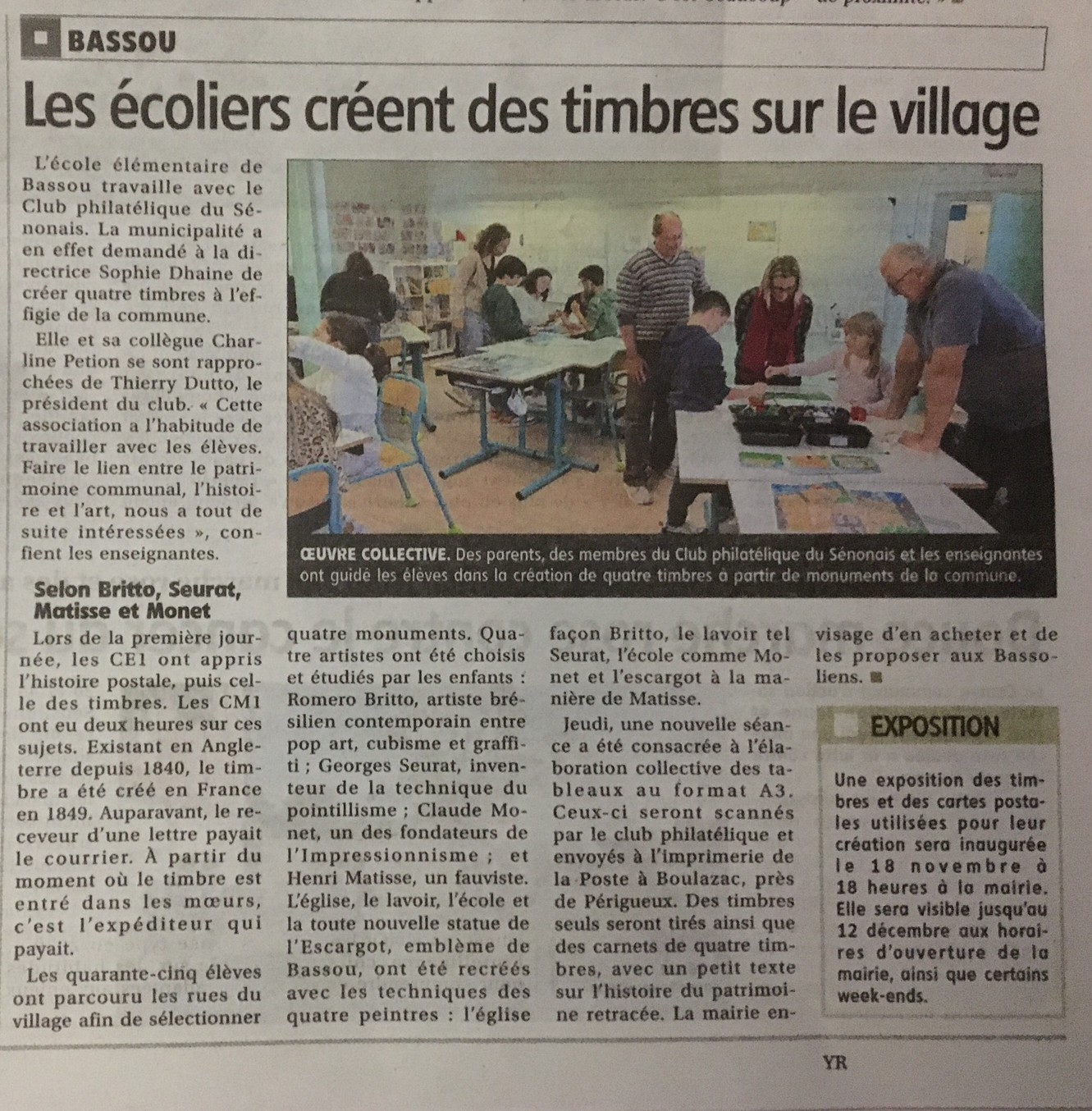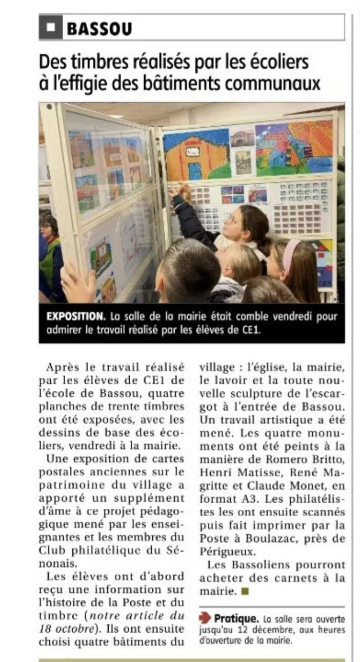 Animation philatélique école de Bassou : publié dans l'Yonne Républicaine du 18 octobre 2025 : YR du 19 octobre 2025